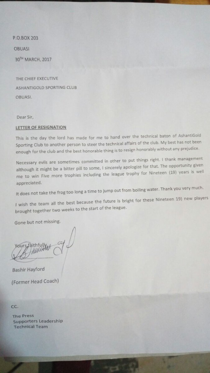 565 days after winning the Ghana Premier League with Ashantigold, Bashir Hayford has relinquished his position as head coach of the club.