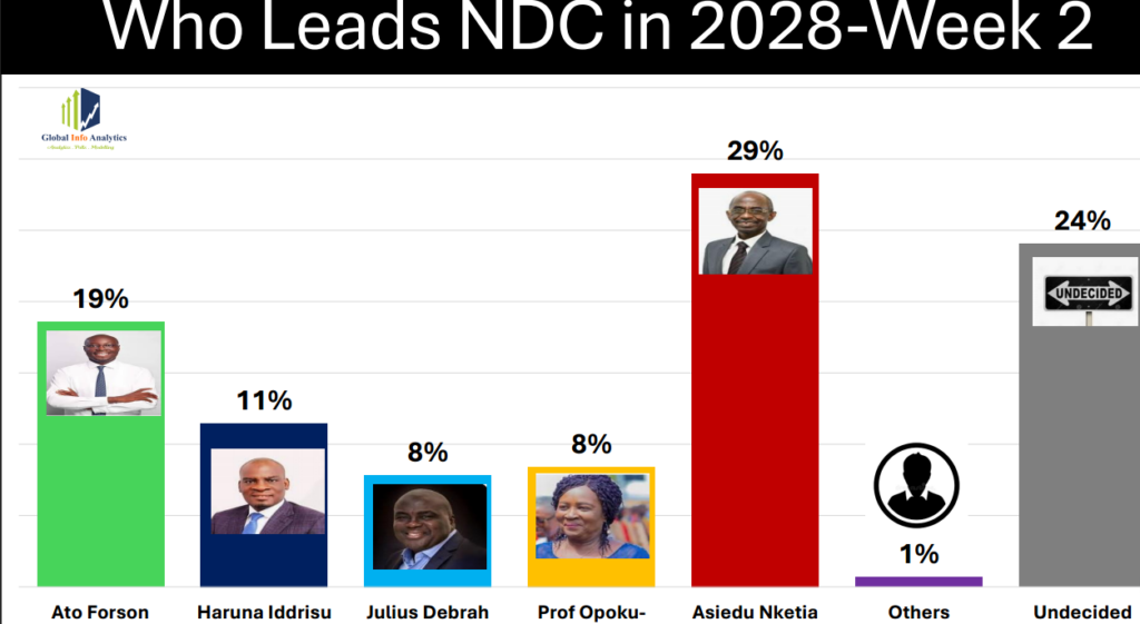 Nketia, who has been criss-crossing the country on a "thank you" tour, leads with 29% support in the second poll round. Ato Forson stands at 19%, followed by Haruna Iddrisu at 11%, Julius Debrah and Prof Jane Naana Opoku-Agyemang tied at 8%, with 1% supporting others and 24% still undecided.