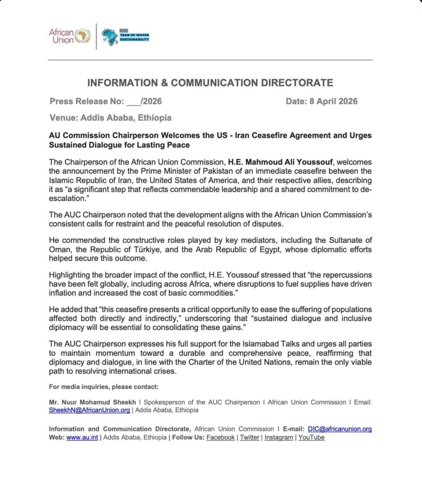 The Chairperson of the African Union Commission, H.E. Mahmoud Ali Youssouf, has expressed strong support for the recent ceasefire announced by the Prime Minister of Pakistan between Iran, the United States, and their allies.