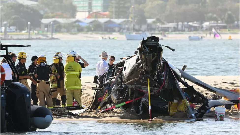 Images from the crash site show debris strewn around the area and a mangled helicopter apparently lying upside down opposite the Seaworld resort.