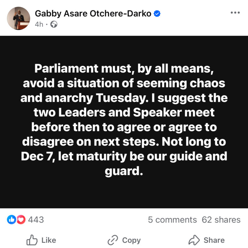 “Parliament must, by all means, avoid a situation of seeming chaos and anarchy Tuesday. I suggest the two Leaders and Speaker meet before then to agree or agree to disagree on the next steps. Not long to Dec 7, let maturity be our guide and guard,” he posted.