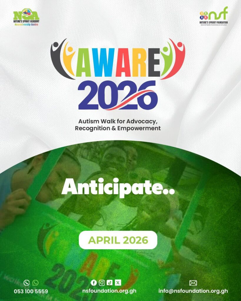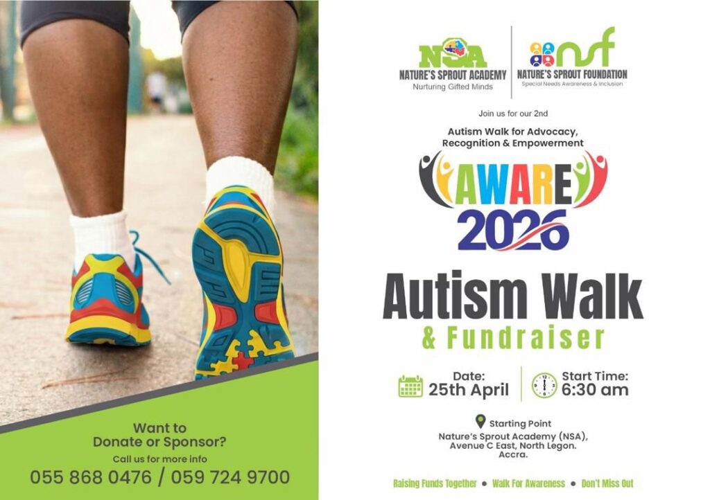 The AWARE 2026 (Autism Walk for Advocacy, Recognition, and Empowerment) is scheduled for Saturday, April 25, 2026, starting at 6:30 AM from the Nature’s Sprout Academy campus at North Legon.