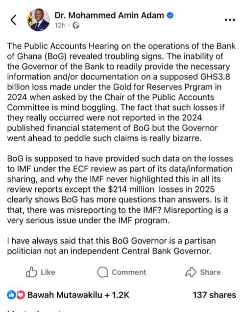 "The Public Accounts Hearing on the operations of the Bank of Ghana (BoG) revealed troubling signs. The inability of the Governor of the Bank to readily provide the necessary information and/or documentation on a supposed GHS3.8 billion loss made under the Gold for Reserves Prgramme in 2024 when asked by the Chair of the Public Accounts Committee is mind-boggling," Dr. Amin Adam wrote on his Facebook page.
