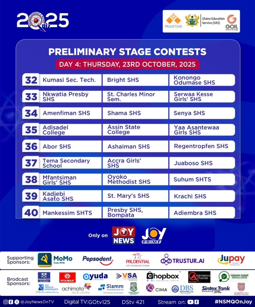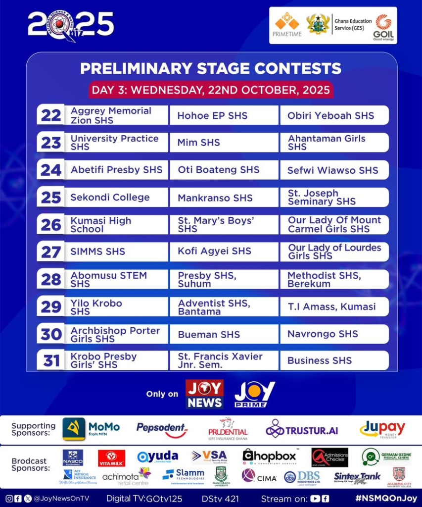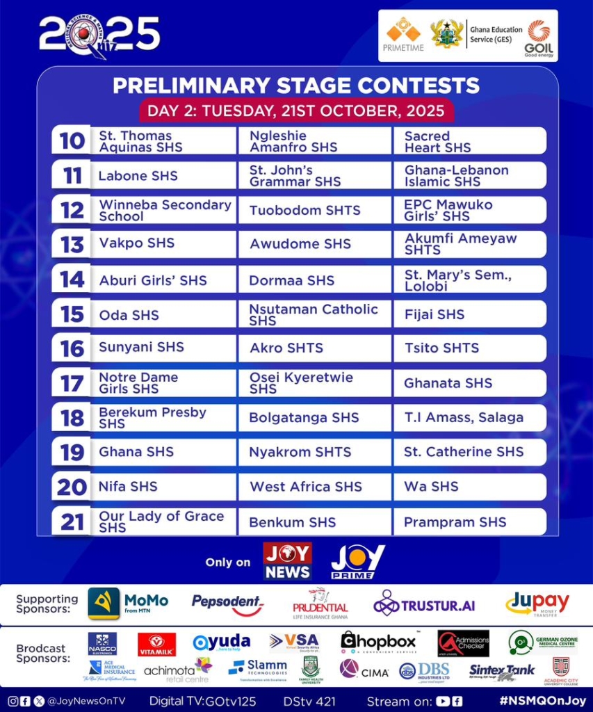 Mark your calendars for the thrilling preliminary contests of the 2025 National Science and Maths Quiz (NSMQ), scheduled to take place from October 20 to 24, 2025. Schools that triumph in this opening stage will progress to the one-eighth round, set for October 26 to 28, 2025.