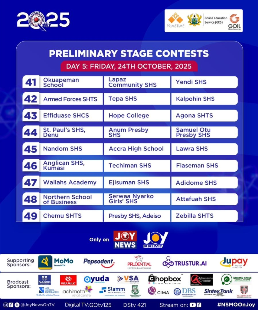 The 2025 National Science and Maths Quiz is produced by Primetime Limited, in partnership with the Ghana Education Service and GOIL PLC, with additional support from Pepsodent, Jupay, and Prudential Life Insurance Ghana.