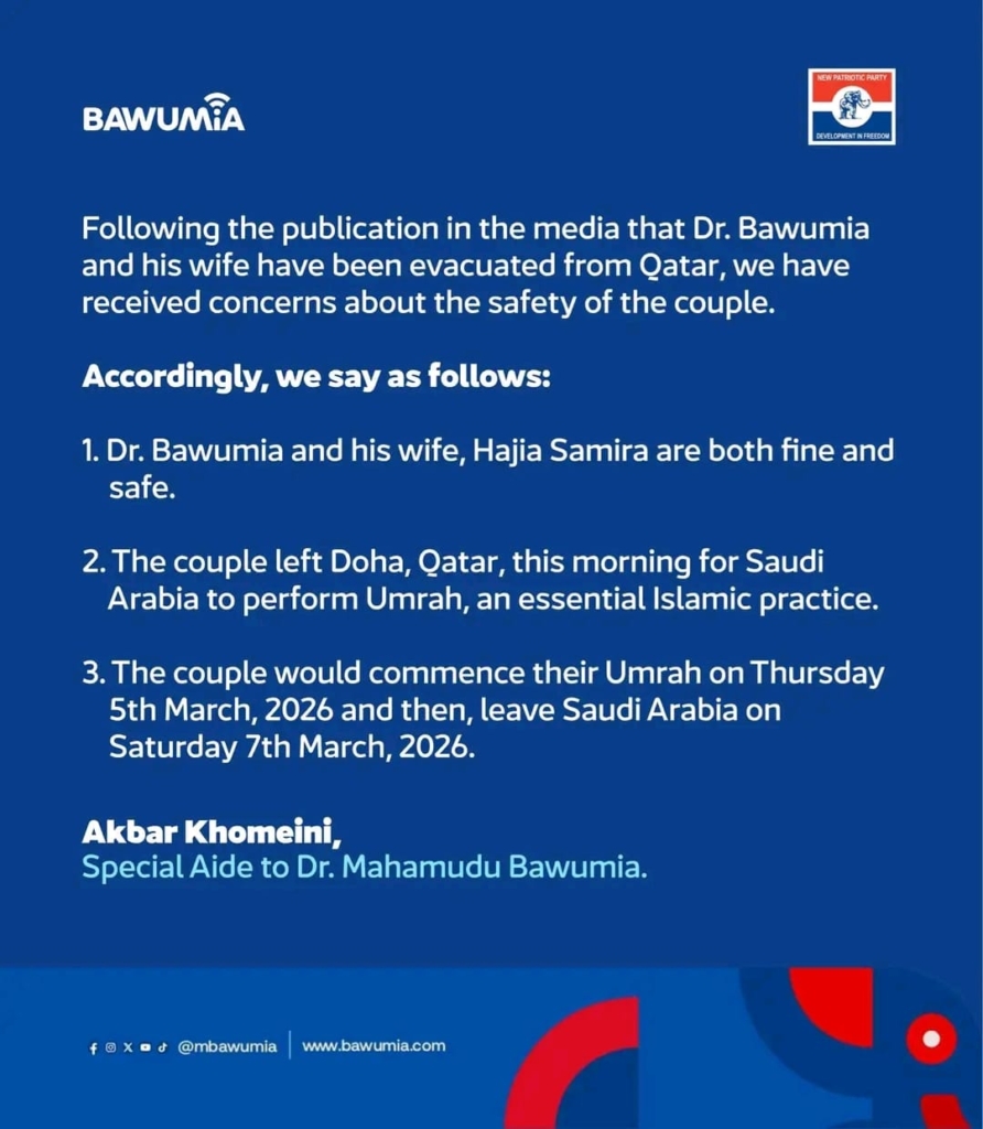 "Dr Bawumia and his wife, Hajia Samira, are both fine and safe. The couple left Doha, Qatar, this morning for Saudi Arabia to perform Umrah, an essential Islamic practice," the statement read.