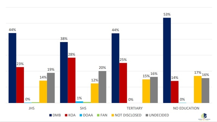 Global Info Analytics' extensive survey of over 4,300 NPP delegates from all corners of Ghana has revealed a striking phenomenon. Bawumia garners 44% support among delegates with tertiary education, while Agyapong trails behind with 25%.