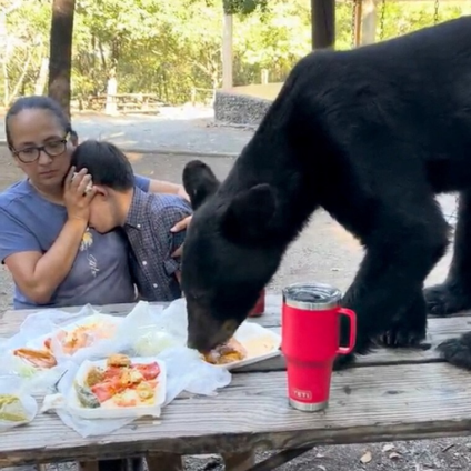 A picnic was interrupted when a hungry black bear approached a group of visitors, mounted their table and ate their food at Mexico's Chipinque Ecological Park in the state of Nuevo León.