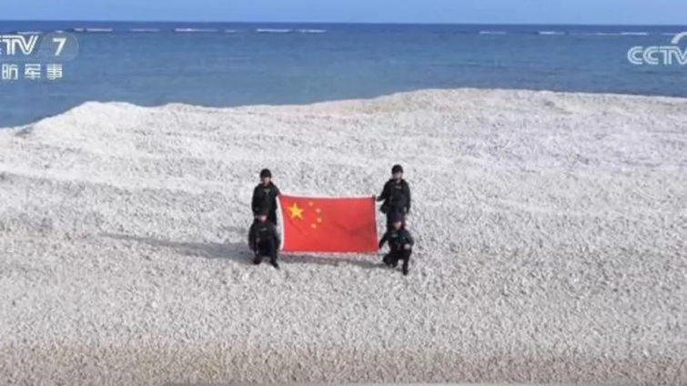 State broadcaster CCTV released images of four officers, wearing all black and holding the Chinese flag, stood on the disputed reef of Sandy Cay in the Spratly Islands.