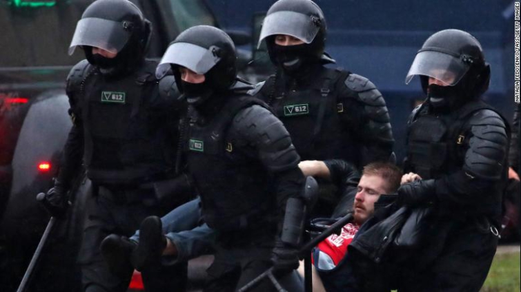Footage published by local news outlets showed police officers wearing black balaclavas dragging protesters into unmarked black vans and beating protesters with their batons at a rally that drew thousands onto the streets of the capital, Minsk.