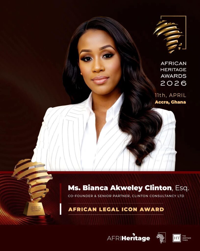 The Mövenpick Ambassador Hotel became the epicentre of continental excellence on Saturday, 11th April 2026, as British-Ghanaian legal luminary Bianca Akweley Clinton was formally decorated as the African Legal Icon at the prestigious African Heritage Awards.