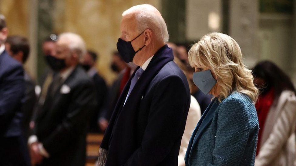 Early on Wednesday Mr Biden attended Mass at a cathedral in Washington - along with four Roman Catholic congressional leaders, both Democrats and Republicans - before making his way to the Capitol.