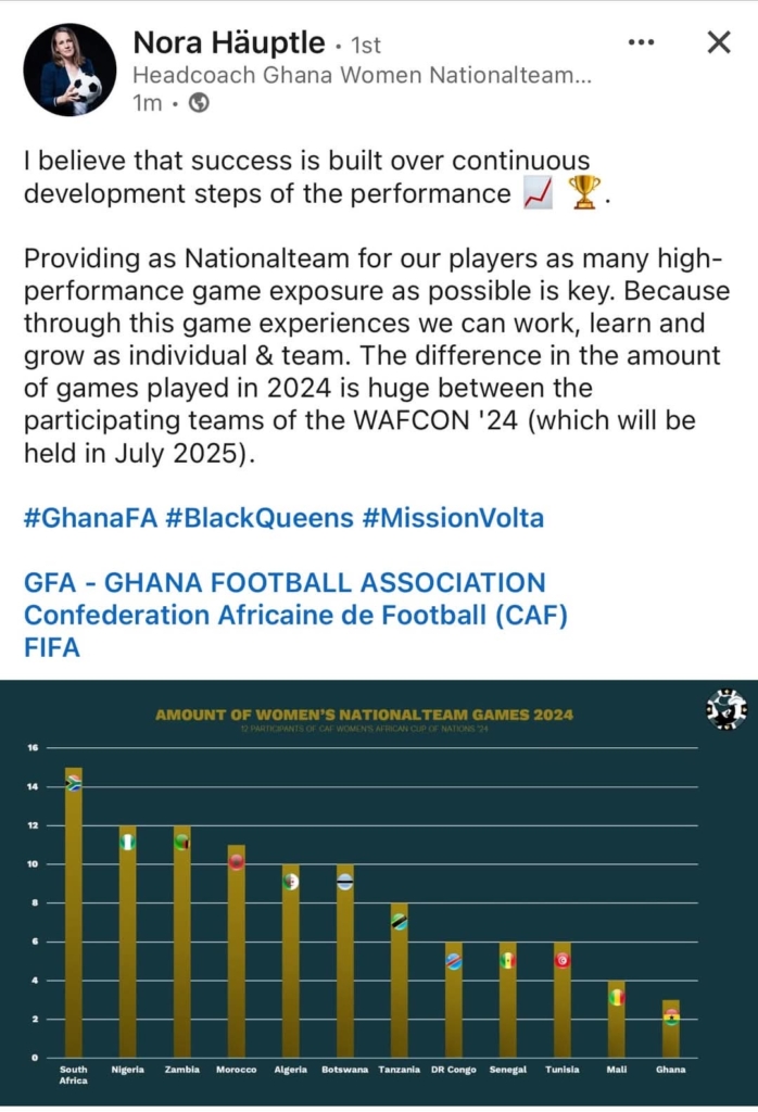 Fueling the speculations, Nora shared a post on her LinkedIN profile where she highlights the Black Queens lack of games as compared to other nations as part of their readiness for 2024 WAFCON.