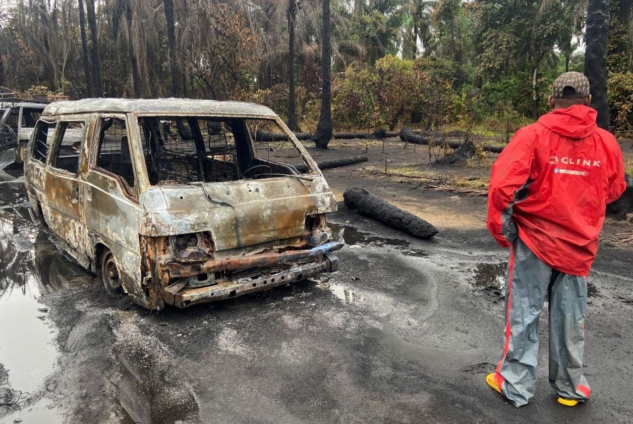 Charred bodies were left scattered among burnt palms, cars and vans on Sunday after a weekend explosion which killed more than 100 people at an illegal oil refining depot on the border of Nigeria's Rivers and Imo states.