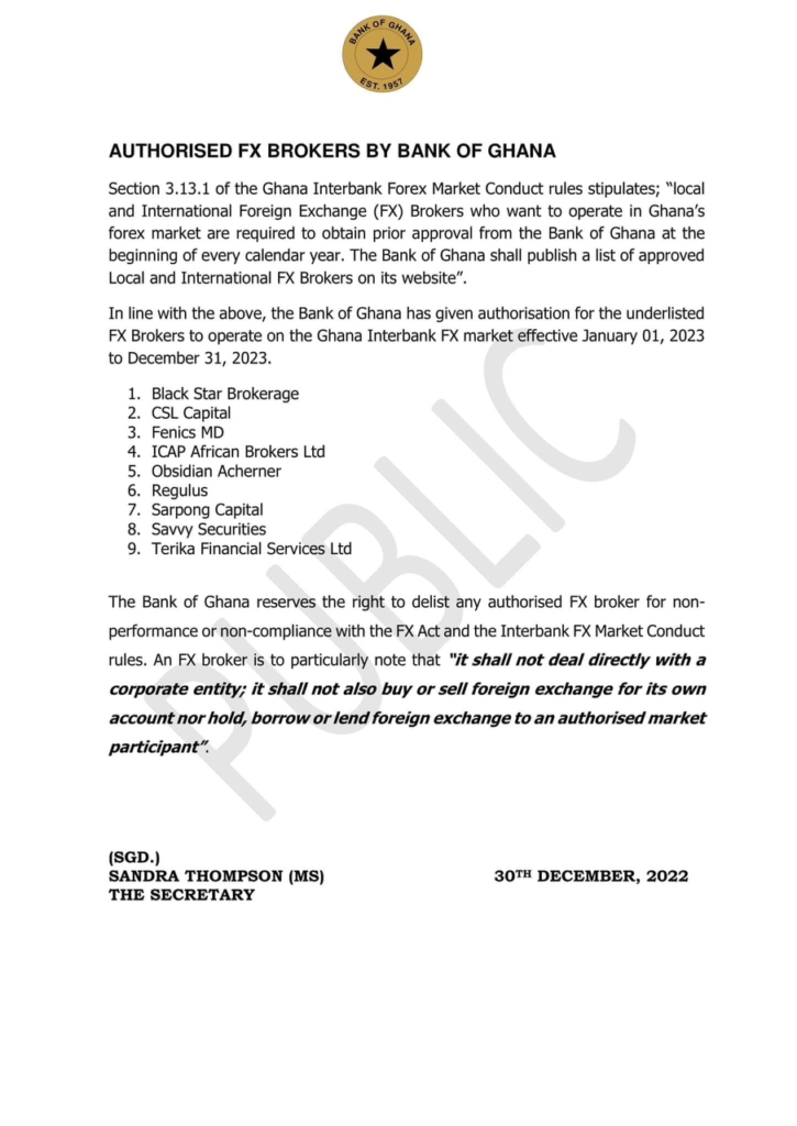 The Bank of Ghana has given authorisation to nine FX (Foreign Exchange) Brokers to operate on the Ghana Interbank FX market, effective January 01, 2023 to December 31, 2023.