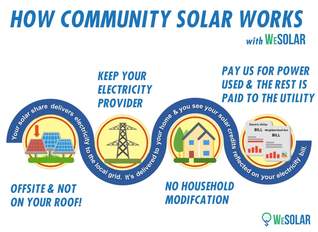 That’s its power: Community solar can be more accessible than the rooftop solar many people know. Instead of purchasing the panels themselves to install on a roof, customers can purchase or lease panels that sit on a solar farm nearby.