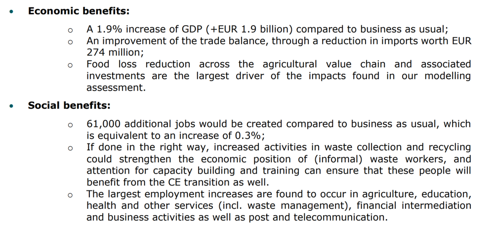 Considering Africa’s status as one of the most marginalized continents, circularity is expected to have massive positive impacts. Modellers relying on Cambridge University’s FRAMES tool who have undertaken deep dives into the prospects of several African countries report substantial gains should the principles of circularity take root. Below is a sample summary of circularity’s benefits to Ghana by 2030 in one such report: