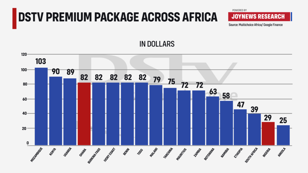 DSTV’s premium package costs $29.05 in Nigeria, $38.66 in South Africa, and $82.41 in Ghana.