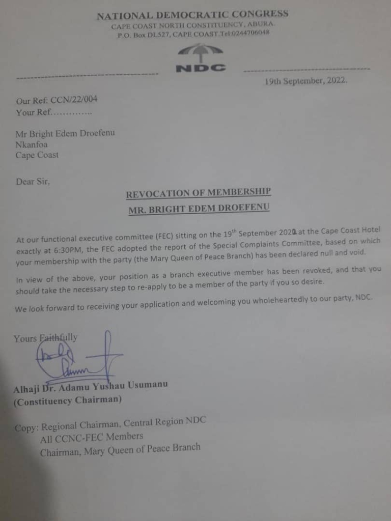 In a letter signed by Cape Coast, North Constituency Chairman of the NDC, Dr. Adamu Yushau Usumanu, the position of Mr. Drofenu as a branch executive member was also revoked.