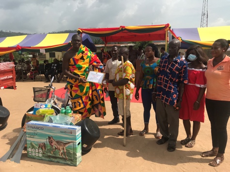 For his prize, he received a tricycle, two bags of fertilizer, six bottles of pesticides, six machetes, one knapsack sprayer and half piece GTP wax print.