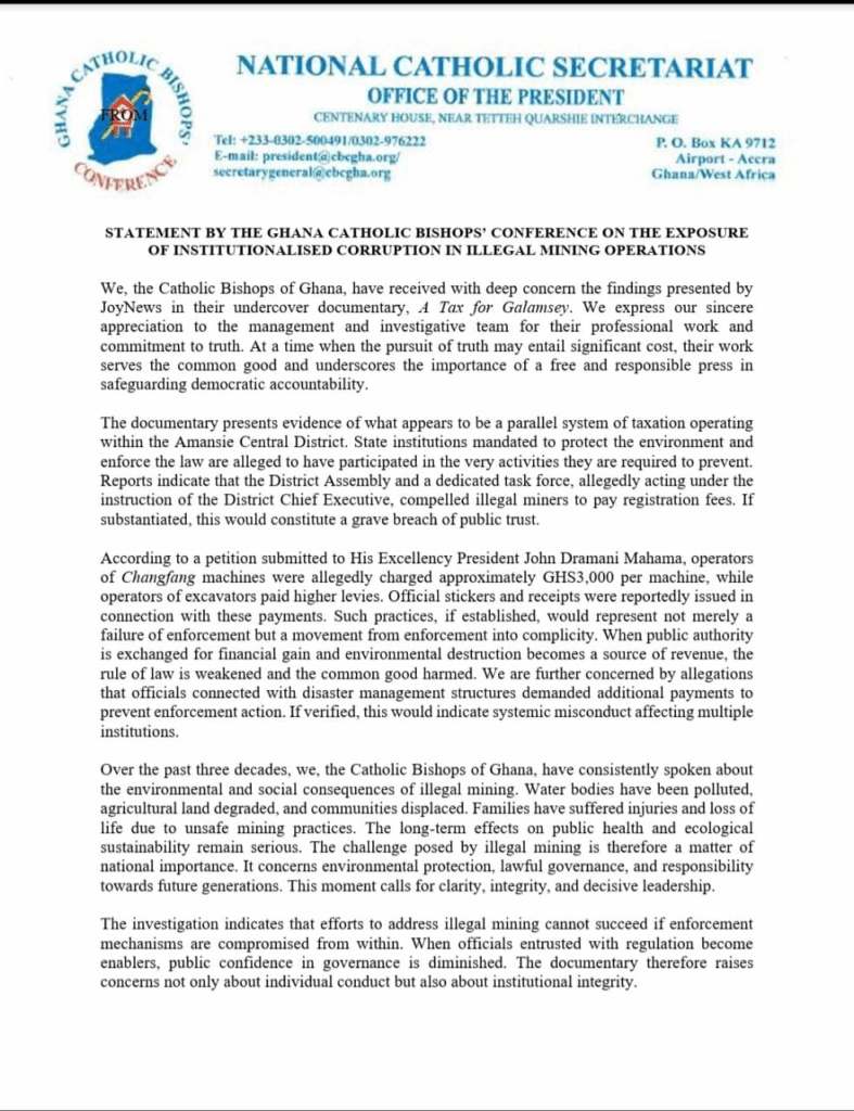 The Catholic Bishops of Ghana have expressed concern following the release of an undercover documentary by JoyNews' titled "A Tax for Galamsey", which uncovered disturbing evidence of a parallel taxation system operating within the Amansie Central District.