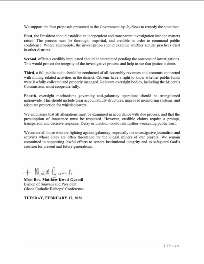 - Independent and Transparent Investigation: The Bishops called on President John Dramani Mahama to establish an independent, transparent investigation into the allegations. They stressed the importance of a thorough, impartial inquiry that would be credible in the eyes of the public and would ensure that similar practices are scrutinised in other districts, if necessary.