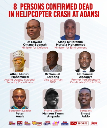 Among those who lost their lives were Edward Omane Boamah, Minister of Defence; Ibrahim Murtala Muhammed, Minister of Environment, Science and Technology; Samuel Sarpong, Vice Chair of the National Democratic Congress and former Kumasi mayor; Alhaji Muniru Mohammed (Limuna), acting Deputy National Security Coordinator; and Samuel Aboagye, Deputy Director-General of the National Disaster Management Organisation (NADMO).