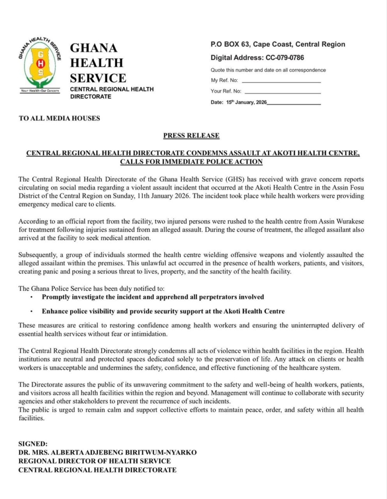 The Central Regional Health Directorate of the Ghana Health Service (GHS) has strongly condemned a violent assault at the Akoti Health Centre in the Assin Fosu District, describing the incident as a grave threat to the safety of health workers, patients, and the integrity of healthcare delivery.
