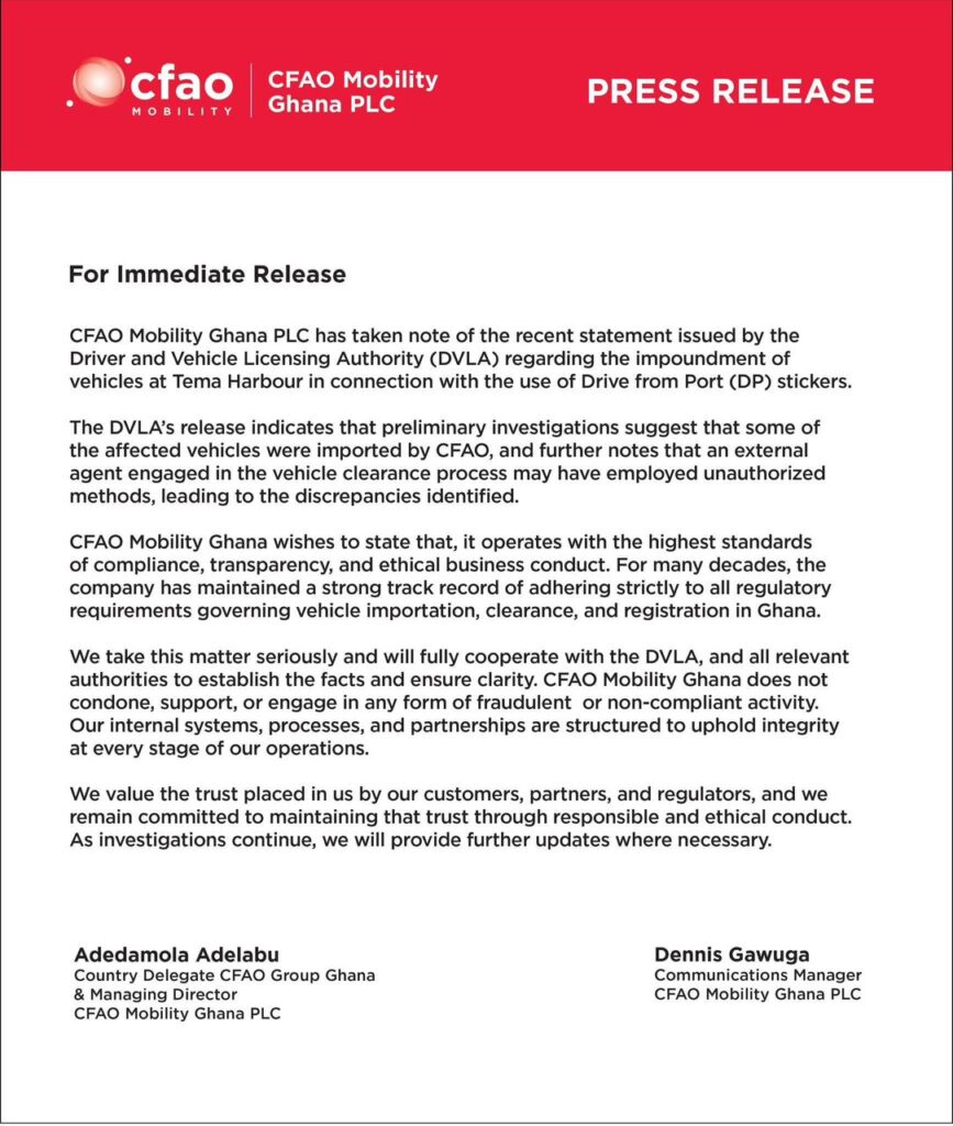 “We take this matter seriously and will fully cooperate with the DVLA and all relevant authorities to establish the facts and ensure clarity. CFAO Mobility Ghana does not condone, support, or engage in any form of fraudulent or non-compliant activity. Our internal systems, processes, and partnerships are structured to uphold integrity at every stage of our operations,” the official statement read.