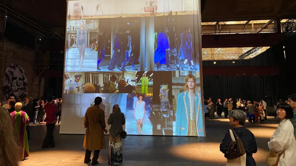 Upon it, huge images of various runway shows over the years are projected. I am transfixed by his use of colour, movement and the joy on the faces of the models.