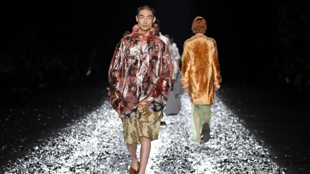 In their wake, models kick up the runway's foil, sending remnants swirling into the atmosphere, like the legacy left behind by Van Noten's career.