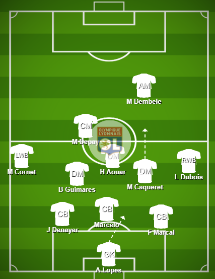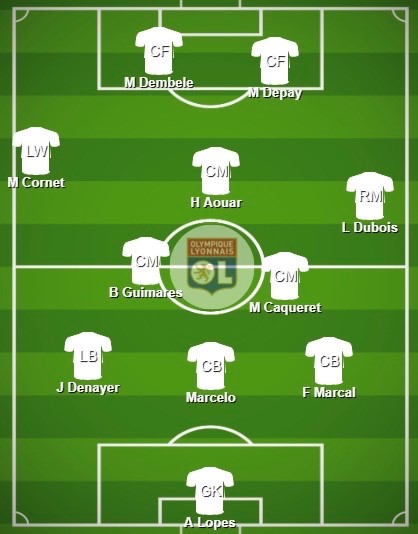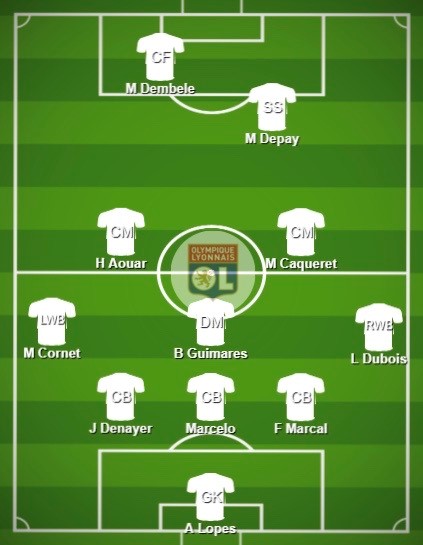 Lyon: Lopes; Denayer, Marcelo, Marçal; Dubois, Caqueret, Guimarães, Aouar, Cornet; Depay, Dembélé