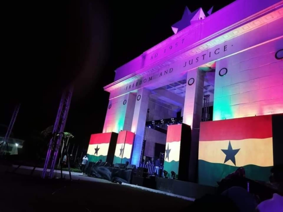 Set up with images of the glowing flag of Ghana under very bright lighting, the Independence Arch, a symbol of the nation's independence from colonial rule is set for the concert.