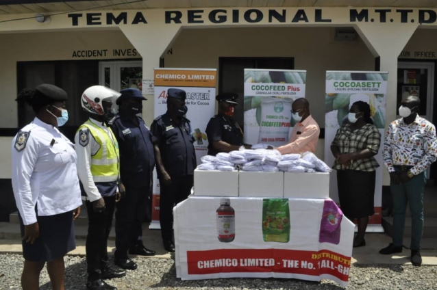 Chemico Ltd has supported the Tema Regional Police Command and the Marine Unit of the Ghana Marine, Ports & Railways with 2,000 pieces of face masks worth GH₵20,000 to support the Covid-19 fight.