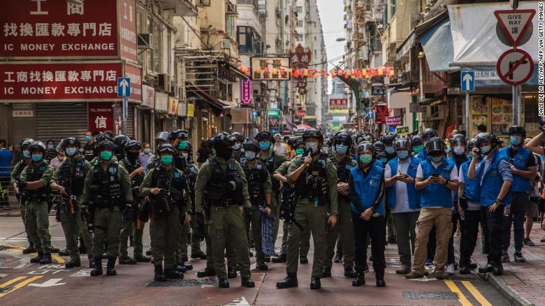 Police patrol in Hong Kong on September 6, 2020 amid protests over the government's decision to postpone elections due to coronavirus, and the national security law.