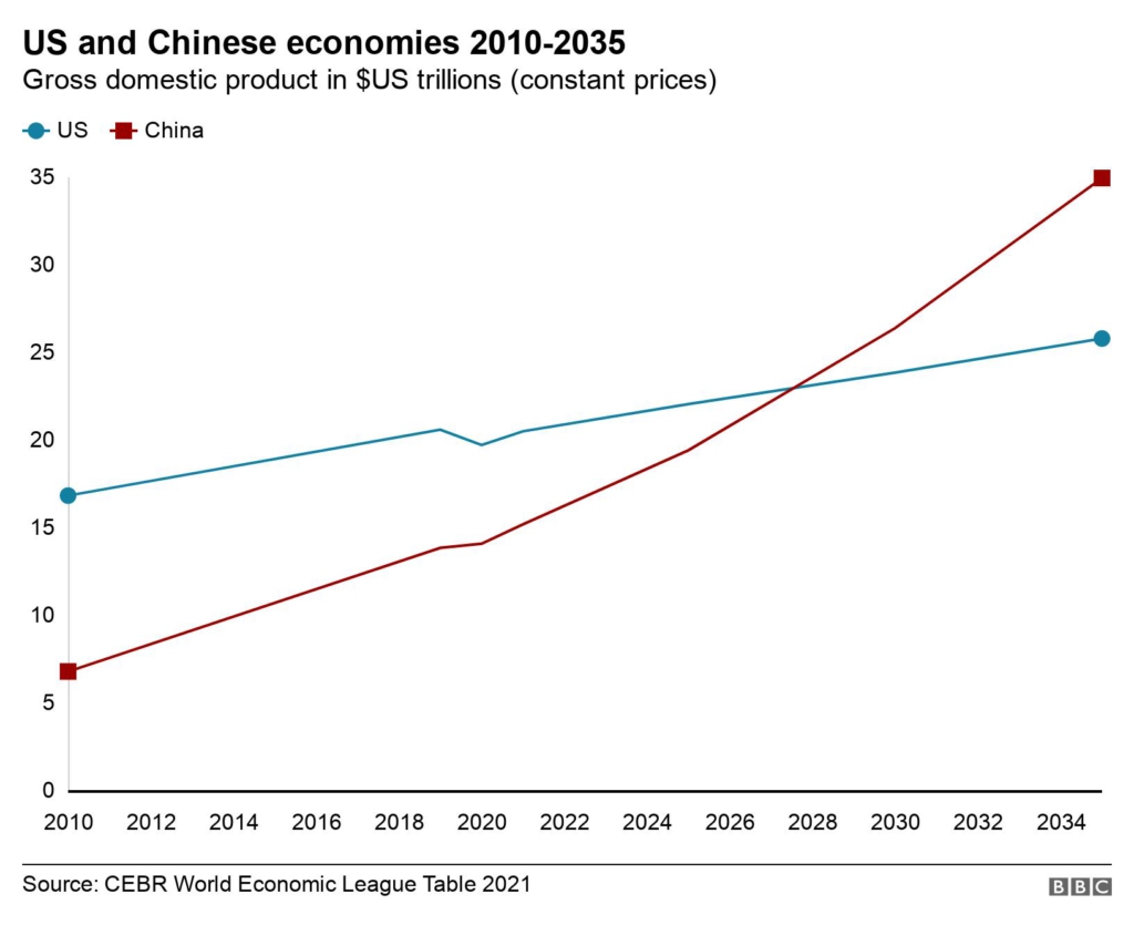 By contrast the Chinese economy is tipped to grow by 5.7% annually until 2025, and 4.5% annually from 2026-2030.
