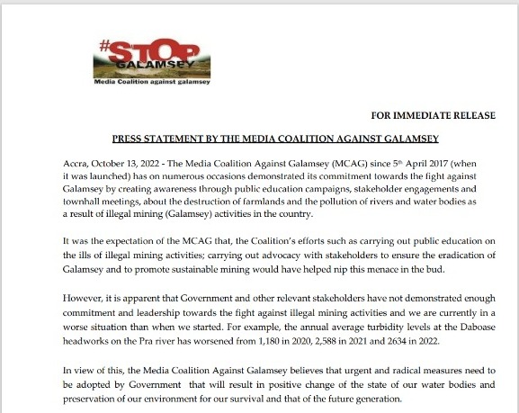 In a press statement issued by the Coalition, on October 13, 2022, it noted that small-scale and surface mining activities must be stopped so that water bodies and forest reserves will be restored.
