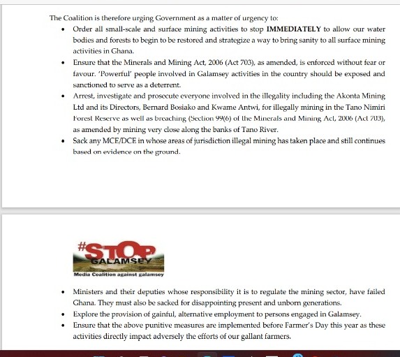 “Order all small-scale and surface mining activities to stop IMMEDIATELY so that our water bodies and forests will begin to be restored and strategize a way to bring sanity to all surface mining activities in Ghana,” the Coalition suggested.