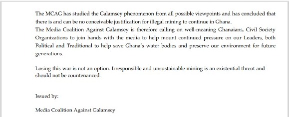 The Media Coalition Against Galamsey (MCAG), has urged the government to order the cessation of all small-scale and surface mining activities in all parts of the country.