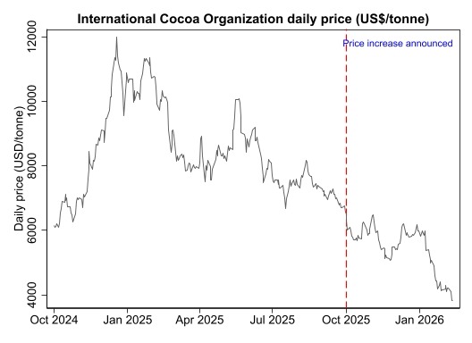However, global cocoa prices began declining soon after October, as shown in the International Cocoa Organization daily price series.