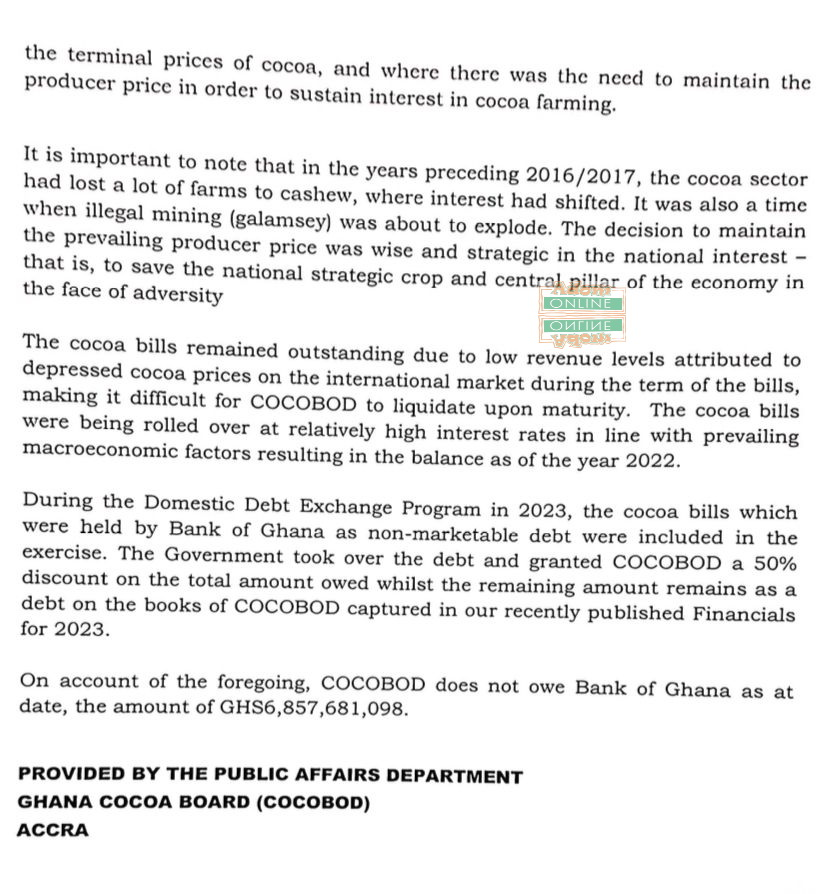 COCOBOD’s Public Affairs Department asserts that the Board has not defaulted on its obligations and continues to manage its debt responsibly.