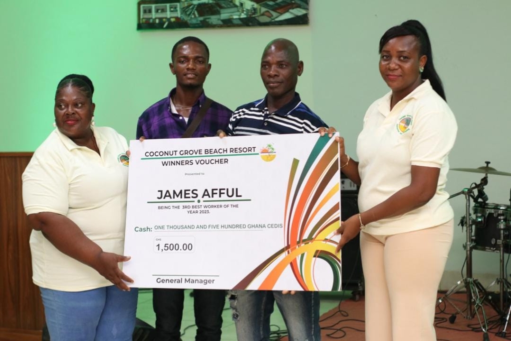 Michael J. Bataah, a grill cook assigned to the Food & Beverage Department, won the worker of the year 2023 and was awarded GHc3,000.00 cash, a citation and a 2-night stay full board at a plush 4-star hotel.