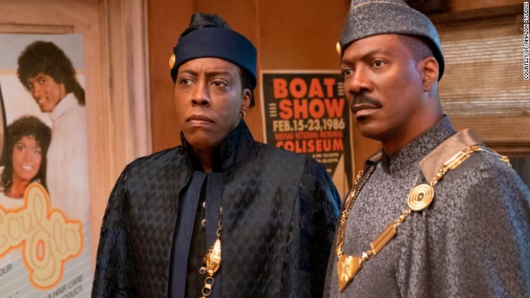 In some first-look photos released on Thursday, King Akeem (Eddie Murphy) reunites with Semmi (Arsenio Hall) as they travel from their beloved Zamunda back to Queens, New York, where their adventures first began.