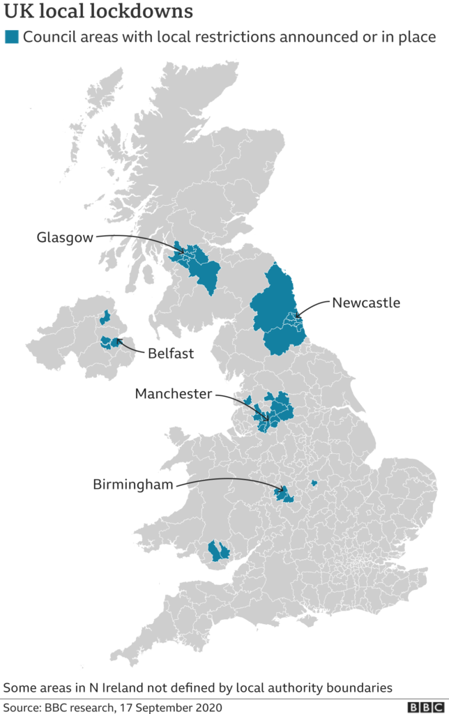 There are also local lockdown restrictions elsewhere in the UK - including Birmingham, Greater Manchester, Caerphilly, and the Belfast council area.