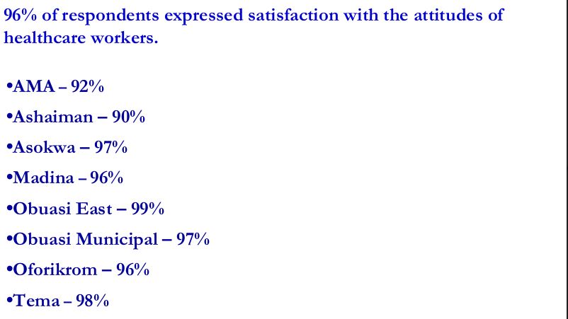 From the report, many beneficiaries of the vaccination in the Greater Accra and Ashanti regions were averagely satisfied with the professionalism of health workers.