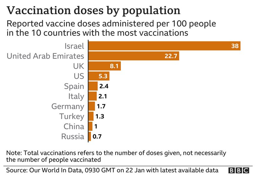 More than a quarter of its population of nine million have received at least one dose of the Pfizer vaccine since 19 December, its health ministry says.