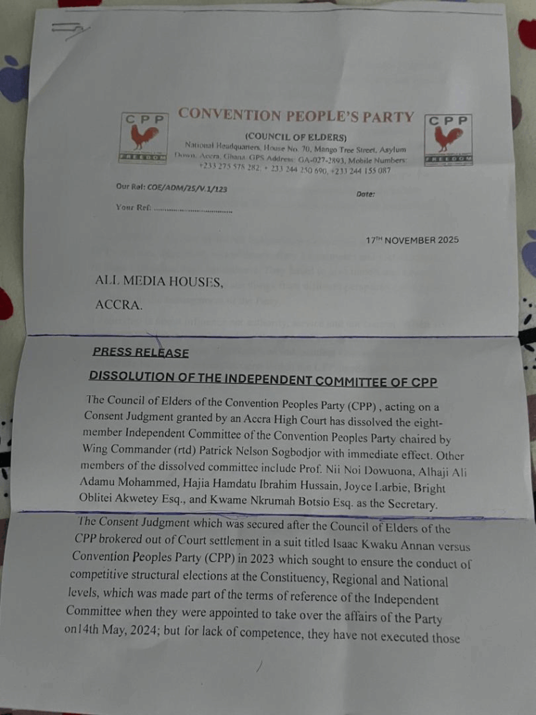 The dissolution follows a Consent Judgment issued by an Accra High Court after a 2023 legal dispute between Isaac Kwaku Annan and the CPP. The court directed the committee to supervise constituency, regional, and national elections as part of efforts to reorganise the party.