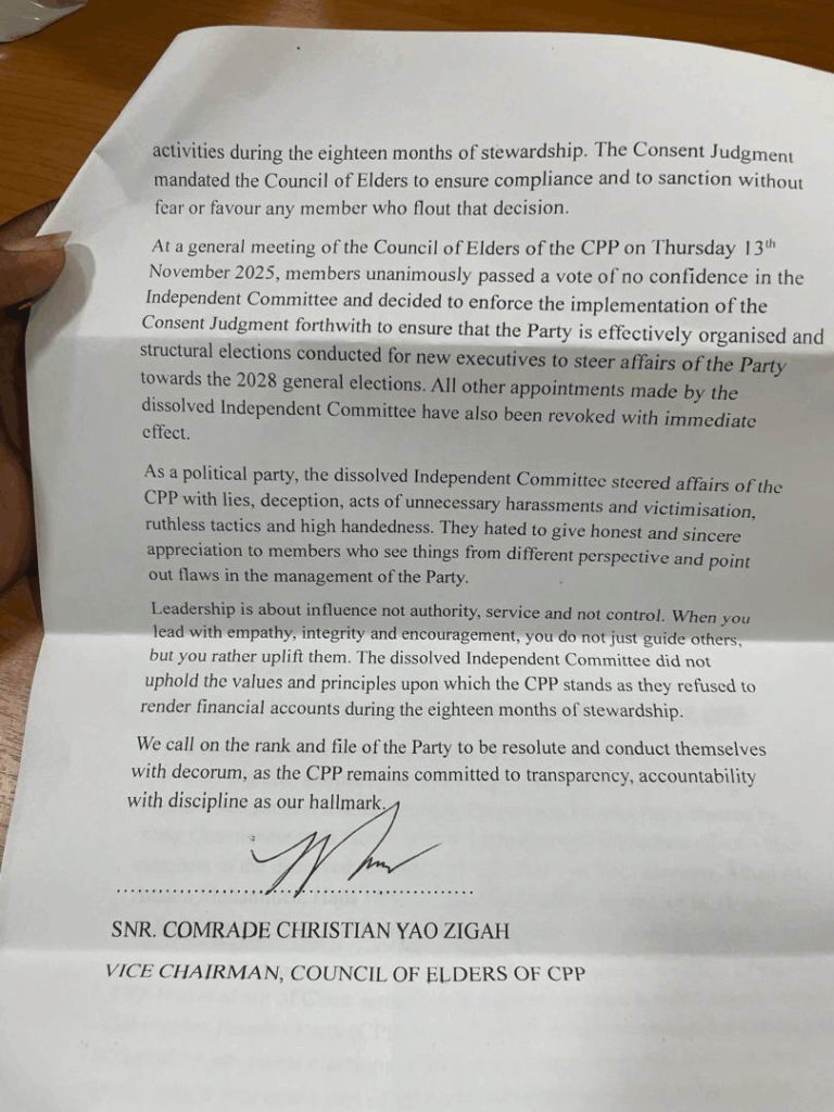 “We call on the rank and file of the Party to be resolute and conduct themselves with decorum, as the CPP remains committed to transparency, accountability, with discipline as our hallmark,” the statement, signed by Senior Comrade Christian Yao Zigah, Vice Chairman of the Council of Elders, said.