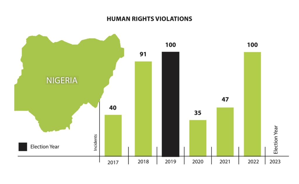 Data on recorded incidents of human rights violations by state or state-sponsored actors against critics and opponents in Nigeria over the period 2017-2022 suggest that political state violence increases during election campaigns. A new surge has been recorded in the run-up to elections scheduled for 25 February 2023.
