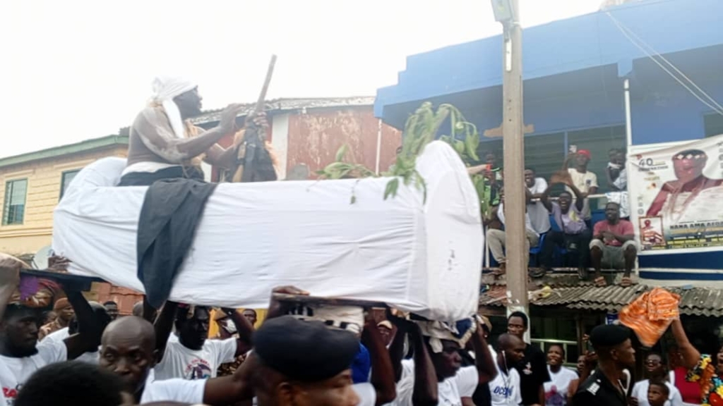 The lifting of the ban on fishing, drumming, and funerals, among other activities, was announced by casting the Omanhen's net thrice in the Benya Lagoon amidst the firing of a gun three times.